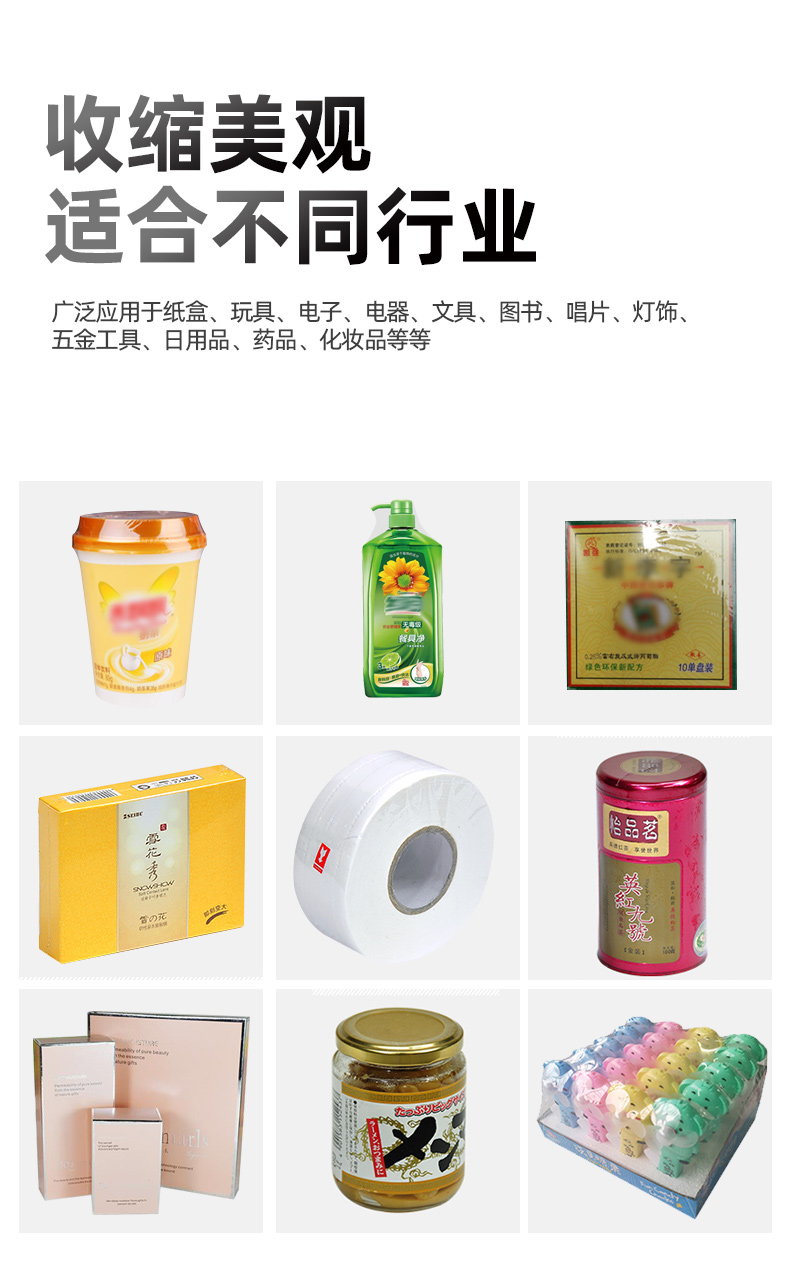 POF收縮機(jī)被廣泛應(yīng)用于紙盒、玩具、電子、電器、文具、圖書(shū)、書(shū)籍、書(shū)本、畫(huà)冊(cè)、相框、相冊(cè)、小黑板、唱片、洗發(fā)水、沐浴露、洗手液、五金工具、電線、日用品、飲料、紀(jì)念標(biāo)簽、透明膠帶、醫(yī)藥盒、食品盒、化妝品盒、茶葉盒、手機(jī)盒、手機(jī)電池盒、移動(dòng)電源盒、數(shù)據(jù)線盒、MP3/MP4紙盒、平板電腦盒、飯盒、盒飯、快餐盒、掛面、面條、桶面、盤紙、卷紙、蔬菜、口罩等商品的熱收縮包裝。