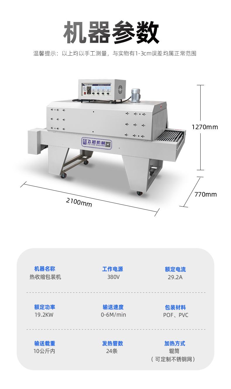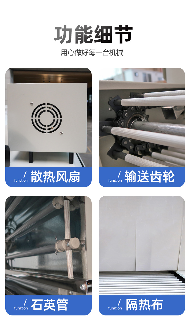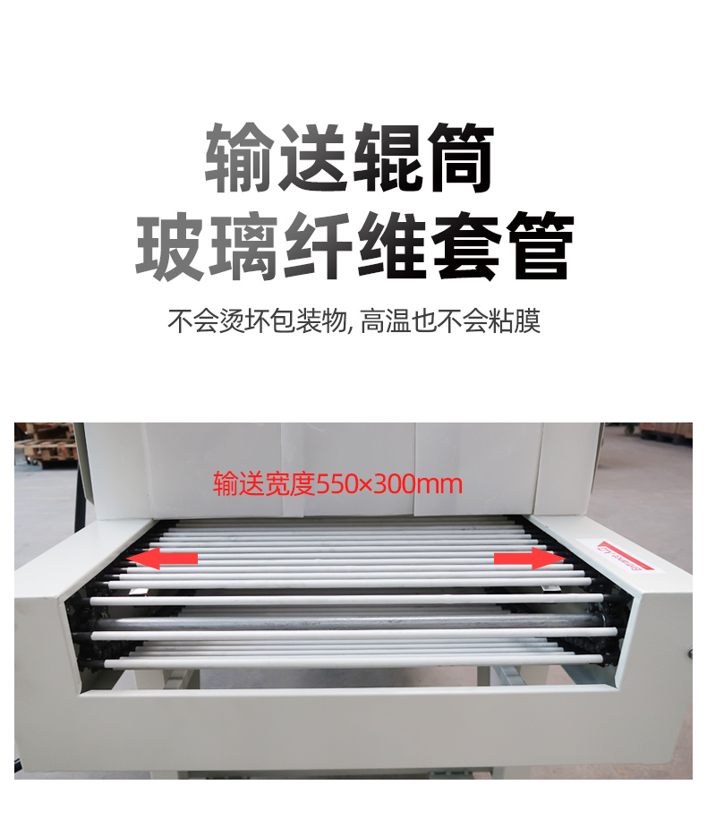 4、輸送輥筒采用玻璃纖維套管,不會(huì)燙壞包裝物,高溫也不會(huì)出現(xiàn)粘膜、套管變形現(xiàn)象