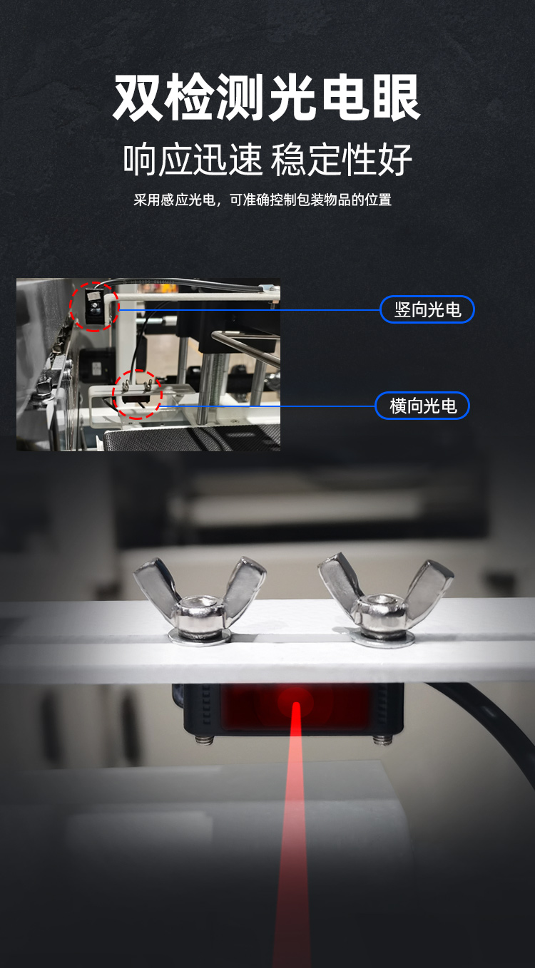 6、雙檢測光電眼,水平和垂直各1組,穩(wěn)定性好,相應迅速,可以包裝很薄的產(chǎn)品