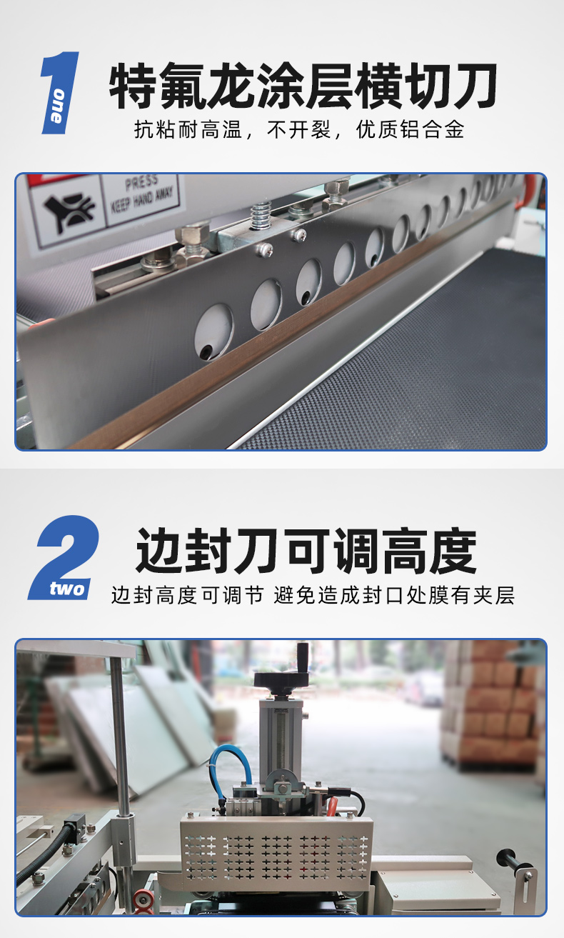 2、特氟龍涂層鋁合金封切刀,抗粘刀耐高溫、封口線牢固不開裂、封切不焦化冒煙,封切刀護(hù)板采用優(yōu)質(zhì)合金鋼不易變形