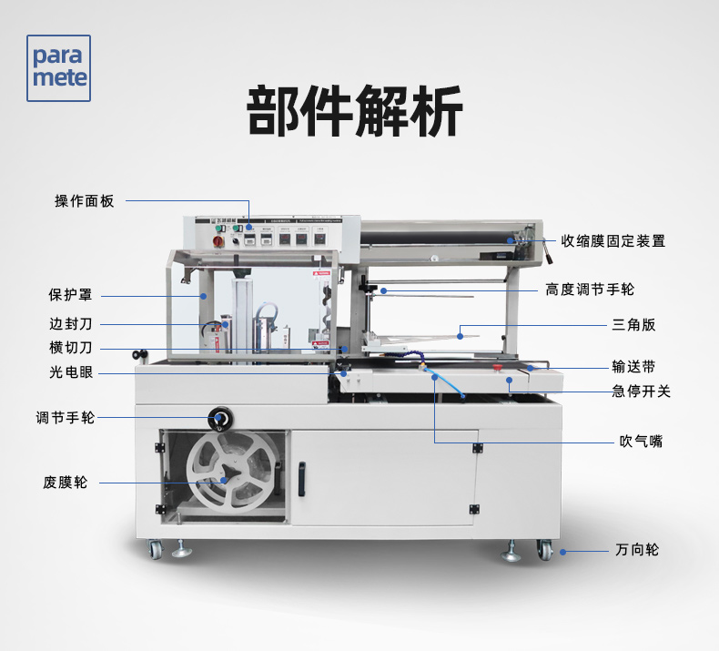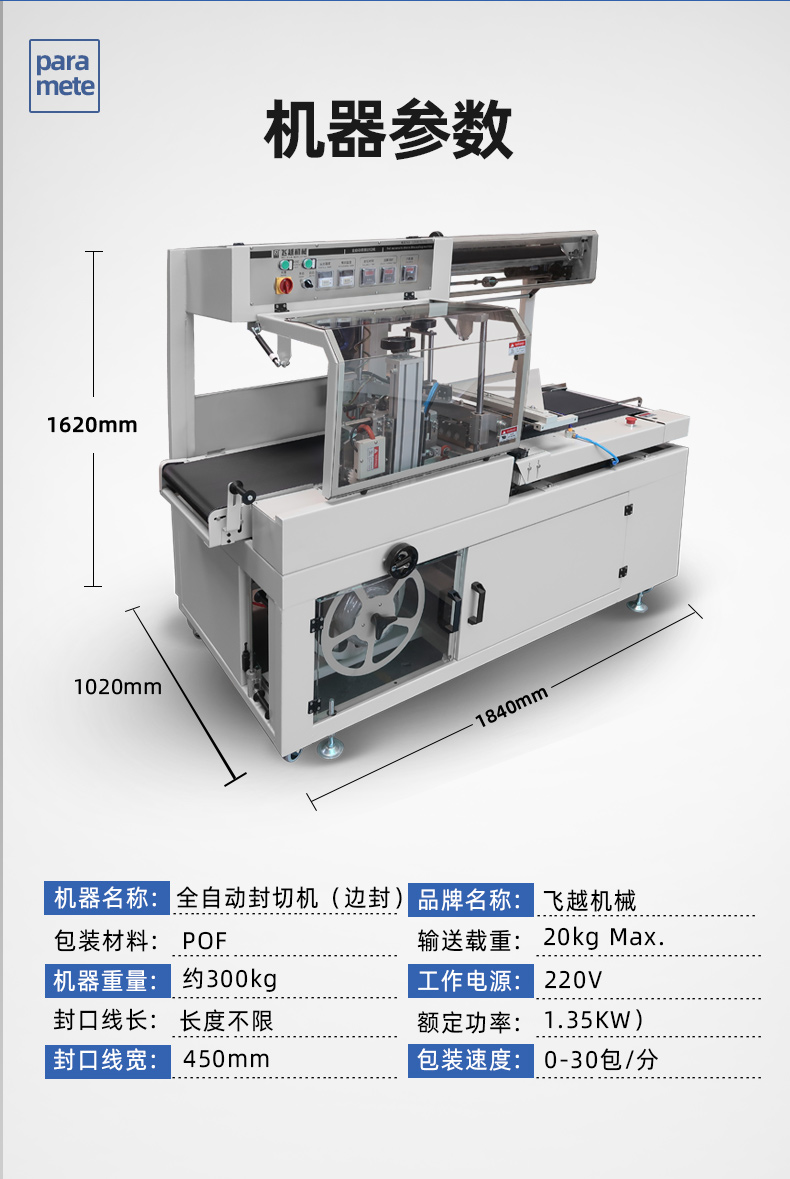 注:封口線長寬不等于包裝尺寸;速度與產(chǎn)品尺寸有關(guān);人工測量存在誤差;重量和尺寸僅供參考,以實際為準(zhǔn);封切機(jī)可根據(jù)小商品定制密接;邊封機(jī)常規(guī)高度為150mm,可定制加高250mm。本套機(jī)器不帶空壓機(jī),需另行選購!