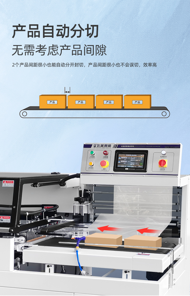 3、產(chǎn)品自動分切,2個產(chǎn)品間距很小也能自動分開封切,防止2個產(chǎn)品太近造成誤切,效率高