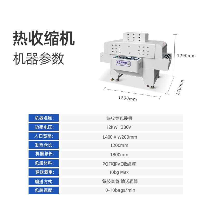 L型全自動封切機(jī)(觸摸屏),后接根據(jù)POF膜特性而設(shè)計(jì)研發(fā)的雙風(fēng)機(jī)熱收縮機(jī),以POF熱收縮膜為包裝材料,對商品進(jìn)行自動套膜封切并自動輸送到熱收縮機(jī)進(jìn)行熱收縮包裝,通過螺旋風(fēng)技術(shù)將加熱管產(chǎn)生的熱量用強(qiáng)勁的風(fēng)力使其均勻散布于整個發(fā)熱倉內(nèi)并傳送到收縮膜表面,使收縮膜達(dá)到所需的溫度而發(fā)生熱收縮反應(yīng)迅速定型,加上外套玻璃纖維套管的輥筒會隨著輸送鏈條的運(yùn)行而勻速滾動,保證商品底部不會出現(xiàn)局部溫度過高而粘膜,解決底部難收縮的困擾,從而使商品收縮良好。