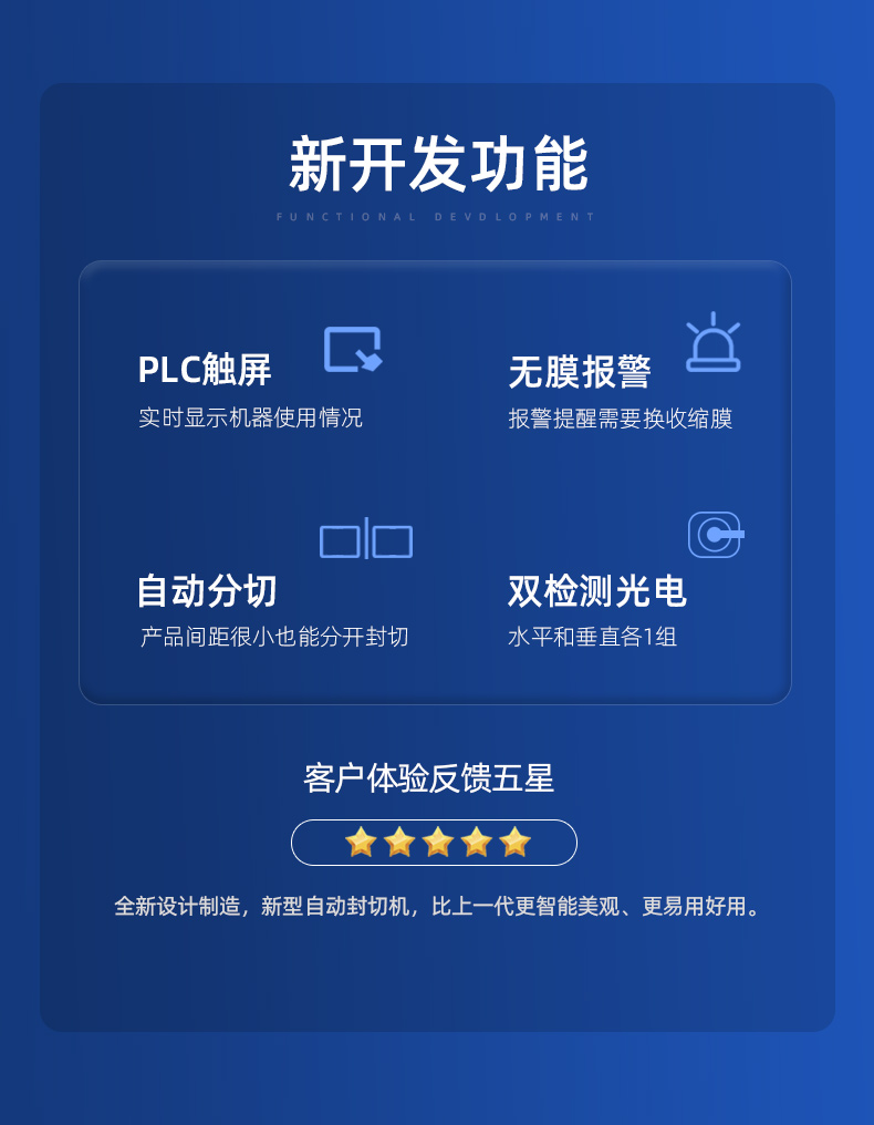 ①使用PLC觸摸屏控制,一學就會,全新設(shè)計并簡化控制線路,方便維護,穩(wěn)定性好;②產(chǎn)品自動分切,哪怕2個相距2cm的產(chǎn)品也能自動分開封切,不會誤切,產(chǎn)品間距很小,大大縮短輸送距離,提高生產(chǎn)效率;③特氟龍涂層鋁合金封切刀,耐用不粘膜,耐高溫不易變形,封口線牢固不開裂,封切不焦化冒煙,好刀是好包裝的前提,封口好,包裝效果才好;④升級雙檢測光電眼,水平光電和垂直光電各1組,可以包裝很薄的產(chǎn)品,擴大了包裝范圍,代替單檢測光電;⑤針輪位置可調(diào),大大方便了包裝多種規(guī)格的產(chǎn)品需要調(diào)節(jié)針孔排氣的情況,只需5秒,免拆卸調(diào)節(jié)針輪位置,舊款要松螺絲拆卸調(diào)節(jié)針輪位置,費時又不便;⑥產(chǎn)品誤切保護,專為安全設(shè)計,安全是好機器必不可少的,當封切刀碰到產(chǎn)品立即停止封切自動彈起,防止誤切,保護切刀、產(chǎn)品和人;