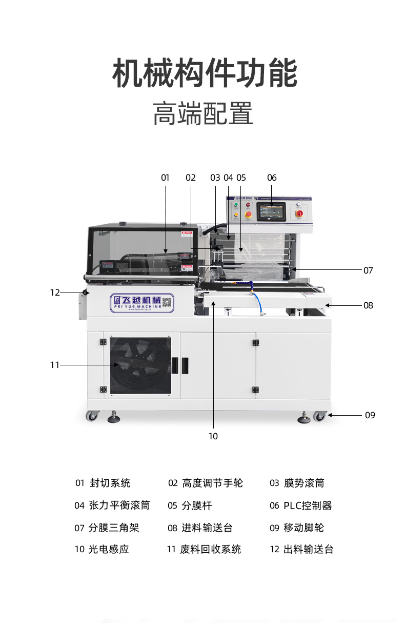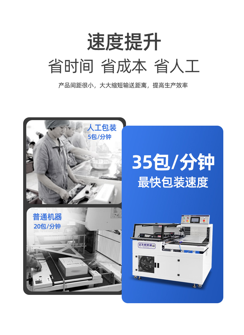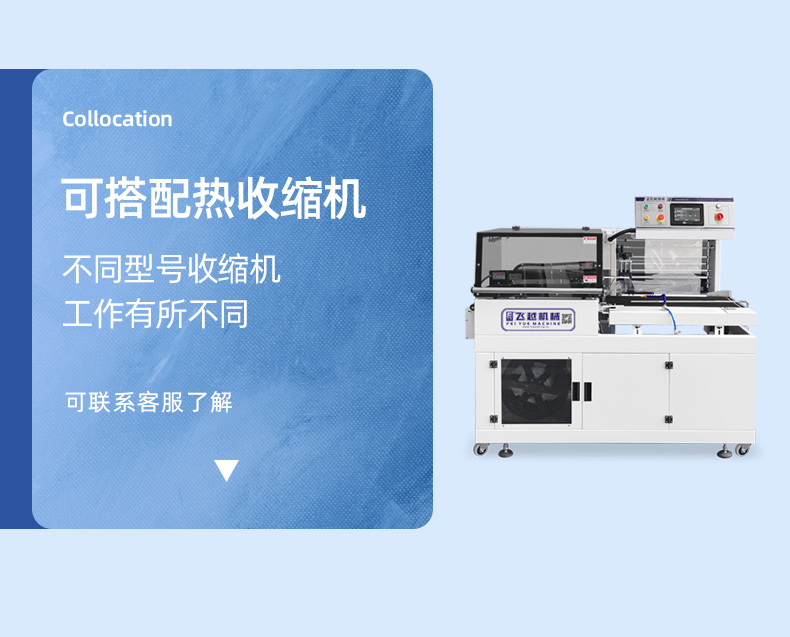 10、自動送料裝置,放到輸送帶的產(chǎn)品,自動進行套膜封切,并輸出到收縮機