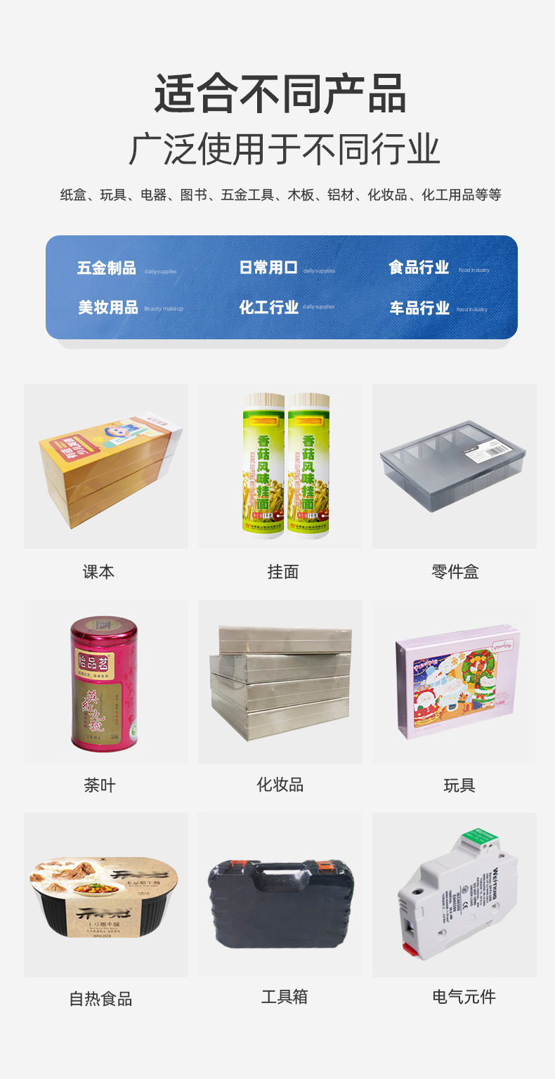 廣泛應(yīng)用于紙盒、玩具、電子、電器、文具、圖書、唱片、五金工具、地板、木板、建材、鋁材、日用品、藥品、飲料、化妝品、化工用品、工藝品、標簽等商品的熱收縮包裝。