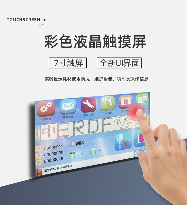 采用7英寸彩色液晶觸摸屏,實(shí)時(shí)顯示耗材使用情況、維護(hù)警告、噴印及操作信息等。