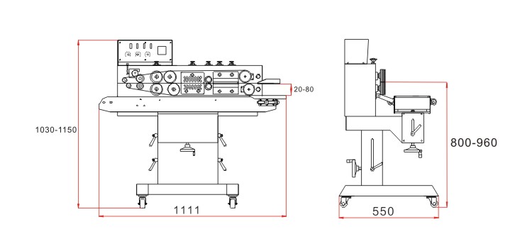3、當(dāng)裝有產(chǎn)品的復(fù)合袋放在輸送帶上,且袋子的封口部分放在兩條封口帶之間,在上下兩條封口帶的夾持和輸送帶的配合下自動(dòng)送入加熱區(qū),封口帶在加熱區(qū)受到兩加熱塊的擠壓,同時(shí)加熱塊的熱量通過(guò)封口帶傳輸?shù)綇?fù)合袋的封口部位從而使復(fù)合袋受熱熔軟后粘合,然后,在封口帶夾持下送入冷卻區(qū),使薄膜表面溫度適當(dāng)下降,然后經(jīng)過(guò)滾花輪(或印字輪)滾壓使復(fù)合袋的封口部分滾壓出條紋狀或網(wǎng)狀(或通過(guò)印字輪壓印出所需的文字),此款為固體墨輪,所以封印花輪封口后輸送到固體墨輪印出黑色字體,可用來(lái)打印簡(jiǎn)單的黑色日期字體,最后由導(dǎo)向橡膠帶與輸送帶配合將封口印碼的復(fù)合袋送出連續(xù)封口機(jī)外面。